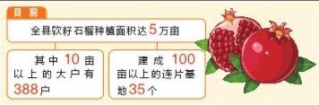 歷經(jīng)了10多年的選育、種植、示范,永勝縣的軟籽石榴產(chǎn)業(yè)已初具規(guī)模。目前,全縣軟籽石榴種植面積達(dá)5萬(wàn)畝,其中種植面積在10畝以上的大戶(hù)有388戶(hù),建成100畝以上的連片基地35個(gè)。