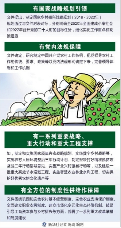——有全方位的制度性供給作保障。文件圍繞鞏固和完善農(nóng)村基本經(jīng)營制度、完善農(nóng)業(yè)支持保護(hù)制度、全面建立職業(yè)農(nóng)民制度、建立市場(chǎng)化多元化生態(tài)補(bǔ)償機(jī)制、鼓勵(lì)引導(dǎo)工商資本參與鄉(xiāng)村振興等方面,部署了一系列重大改革舉措和制度建設(shè)。