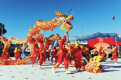 9月23日,秋高氣爽,艷陽高照,首屆中國農民豐收節(jié)隆重舉行,主會場設在北京農業(yè)展覽館。圖為來自北京市平谷區(qū)的農民舞龍隊在盡情表演,以表達五谷豐登喜慶豐收的喜悅心情。