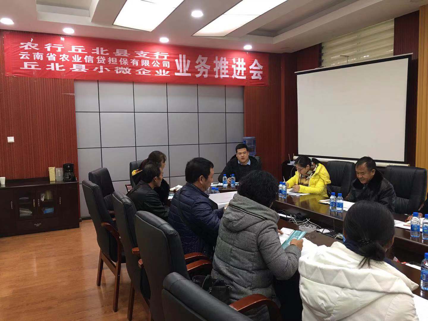 12月16日下午,農(nóng)擔公司硯山辦事處受邀到中國農(nóng)業(yè)銀行股份有限公司丘北縣支行參加丘北縣小微企業(yè)業(yè)務推進會。丘北縣工商聯(lián)主任楊沖、丘北縣農(nóng)行分管信貸業(yè)務的副行長羅紅丹、丘北縣涉農(nóng)中小企業(yè)、示范合作社代表30余人出席會議。