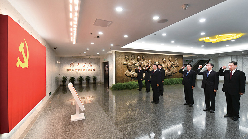 2017年10月31日,中共中央總書記、國家主席、中央軍委主席習近平帶領中共中央政治局常委李克強、栗戰(zhàn)書、汪洋、王滬寧、趙樂際、韓正,瞻仰上海中共一大會址和浙江嘉興南湖紅船。這是31日上午,在上海中共一大會址紀念館,習近平帶領其他中共中央政治局常委同志一起重溫入黨誓詞。