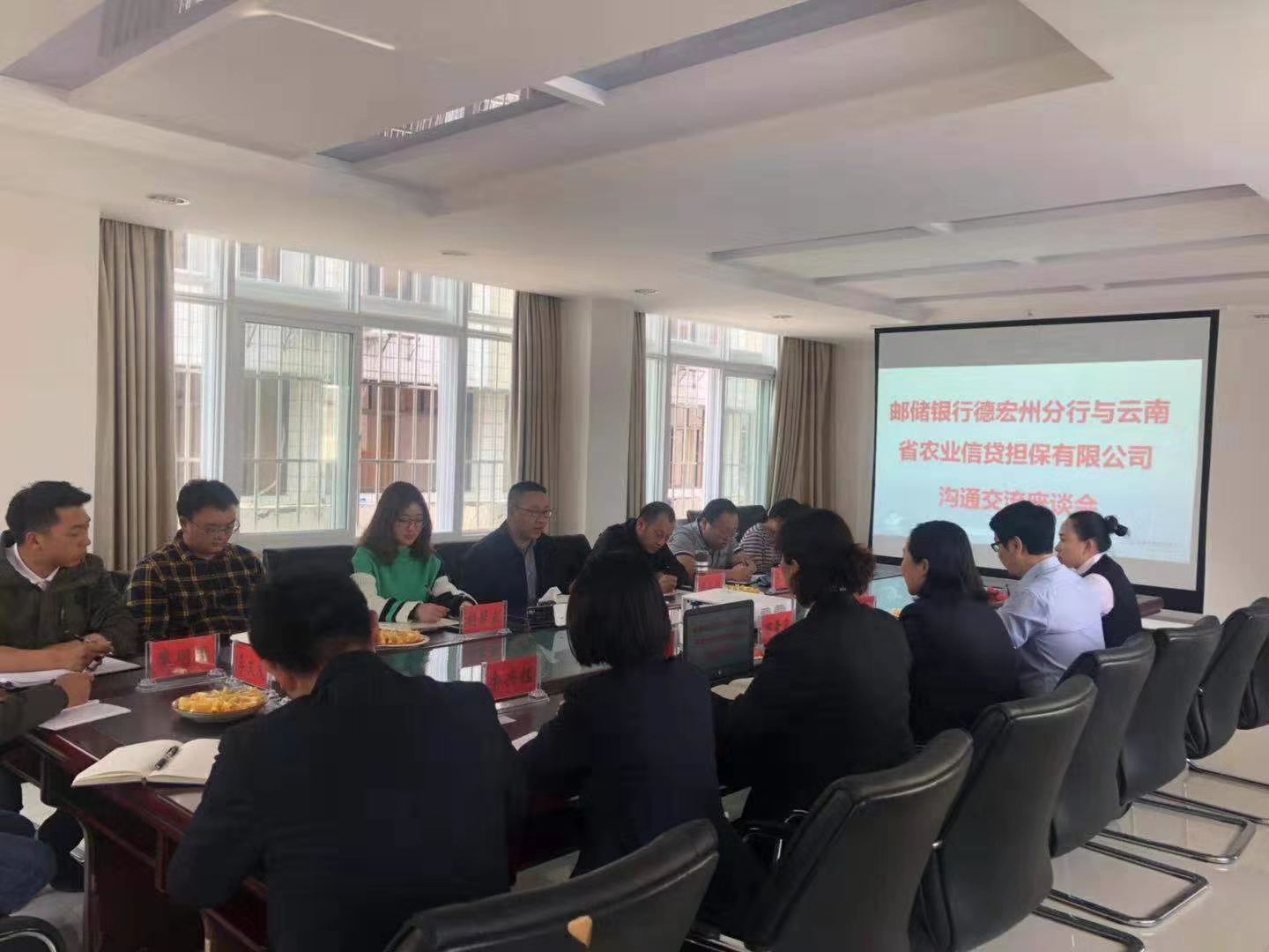2019年2月19日下午,農(nóng)擔(dān)公司副總經(jīng)理廖寅皓、風(fēng)控部負(fù)責(zé)人張長浩、農(nóng)擔(dān)二部負(fù)責(zé)人賈萬文、機(jī)構(gòu)合作部負(fù)責(zé)人蔡菲帶領(lǐng)德宏辦事處人員至郵儲銀行德宏州分行,與郵儲銀行德宏州分行副行長鄭素霞,小企業(yè)金融部總經(jīng)理劉娜,個貸部總經(jīng)理吳剛林進(jìn)行交流座談。