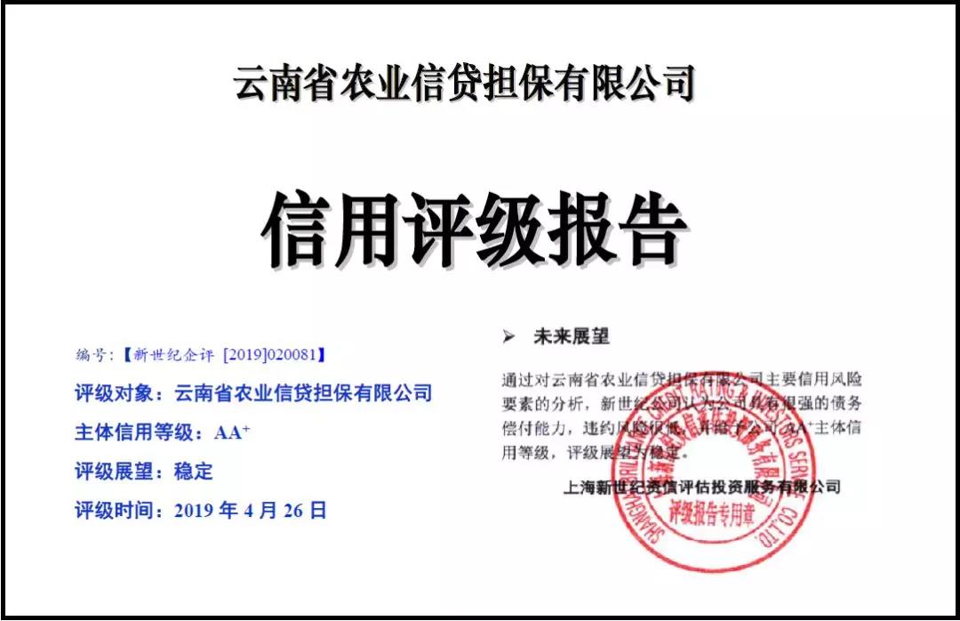 云南省農(nóng)業(yè)信貸擔(dān)保有限公司通過一年的努力,企業(yè)主體信用評級在2017年AA等級的基礎(chǔ)上再上一個臺階,2018年主體信用等級被評定為AA+,評級展望為“穩(wěn)定”,成為自全國農(nóng)業(yè)信貸擔(dān)保體系組建以來,第一批獲此殊榮的省級農(nóng)業(yè)擔(dān)保機構(gòu)。