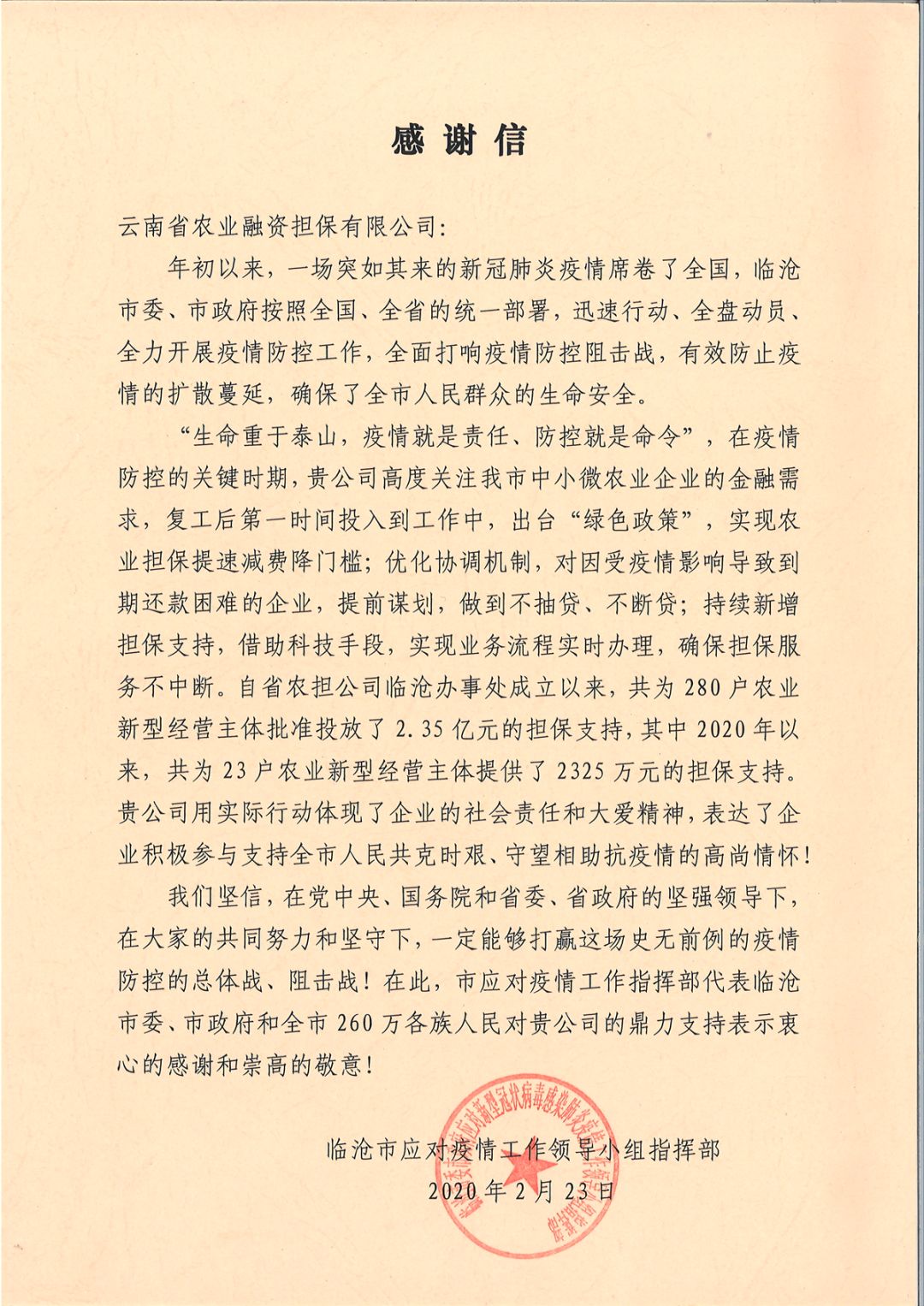 2月23日,臨滄市應對疫情工作領導小組指揮部向云南農(nóng)擔公司發(fā)來致函,對在新冠肺炎疫情期間,公司積極履行職責,為臨滄市新型農(nóng)業(yè)經(jīng)營主體融資需求紓困,表示由衷感謝。今年以來,公司為臨滄市23戶農(nóng)業(yè)新型經(jīng)營主體提供了2325萬的擔保支持,并在疫情期間出臺“綠色”政策,積極扶持新型農(nóng)業(yè)經(jīng)營主體共渡難關。