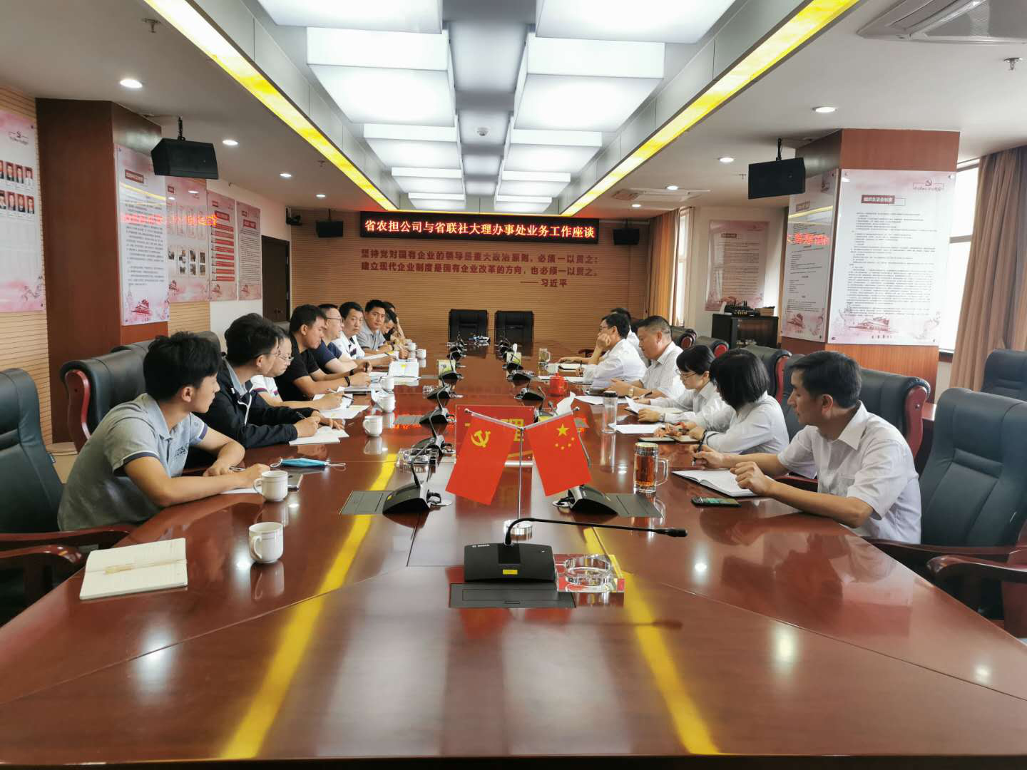 6月19日,調(diào)研組一行到省聯(lián)社大理辦事處座談。雙方就目前合作的情況以及業(yè)務(wù)進(jìn)行深入交流,省聯(lián)社大理辦事處黃景勝主任表示,通過(guò)此次交流活動(dòng),加強(qiáng)了雙方溝通互信,將依托大理州較好的信用環(huán)境,充分發(fā)揮信用社業(yè)務(wù)優(yōu)勢(shì),加強(qiáng)與省農(nóng)擔(dān)公司合作,在風(fēng)險(xiǎn)可控前提下積極擴(kuò)大農(nóng)擔(dān)業(yè)務(wù)覆蓋面。