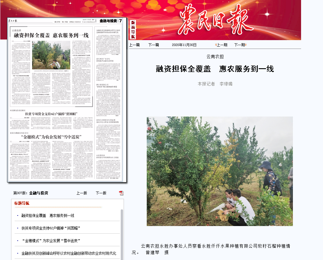 10月,國家農(nóng)擔(dān)公司微信公眾號“農(nóng)擔(dān)經(jīng)驗談”專欄中對云南農(nóng)擔(dān)公司認(rèn)真貫徹落實(shí)云南省脫貧攻堅等扶貧政策,支持麗江永勝縣農(nóng)業(yè)生產(chǎn)、帶動貧困戶脫貧增收,積極為當(dāng)?shù)匦滦娃r(nóng)業(yè)經(jīng)營主體提供融資擔(dān)保服務(wù)進(jìn)行了宣傳。《農(nóng)民日報》從國家農(nóng)擔(dān)公司了解到云南農(nóng)擔(dān)支農(nóng)惠農(nóng)的相關(guān)情況后,11月30日以《融資擔(dān)保全覆蓋 惠農(nóng)服務(wù)到一線》為題報道了云南農(nóng)擔(dān)公司成立以來,不斷完善分支機(jī)構(gòu)布局,實(shí)現(xiàn)了機(jī)構(gòu)、業(yè)務(wù)和人員的全面下沉,形成了覆蓋全省的農(nóng)擔(dān)基層服務(wù)網(wǎng)絡(luò)體系,以點(diǎn)帶面、立足當(dāng)?shù)?,為推動縣域經(jīng)濟(jì)和云南高原特色農(nóng)業(yè)產(chǎn)業(yè)發(fā)展、推進(jìn)農(nóng)業(yè)供給側(cè)結(jié)構(gòu)性改革、助力脫貧攻堅、助推“鄉(xiāng)村振興”戰(zhàn)略實(shí)施發(fā)揮了積極作用。
