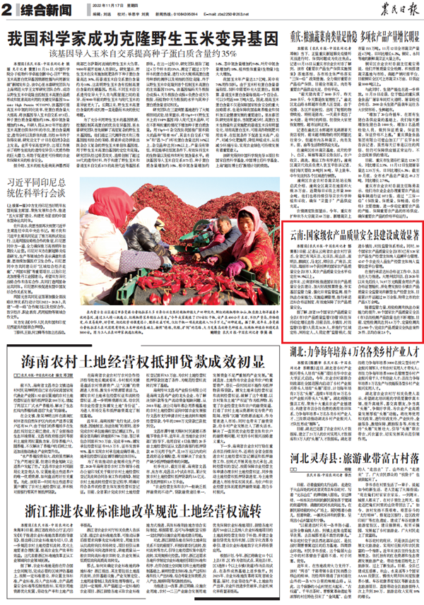 國(guó)家級(jí)農(nóng)產(chǎn)品質(zhì)量安全縣建設(shè)成效顯著!《農(nóng)民日?qǐng)?bào)》刊文點(diǎn)贊云南
