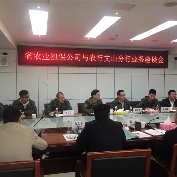 2018年11月26日,省農(nóng)擔(dān)公司領(lǐng)導(dǎo)一行攜硯山辦事處負(fù)責(zé)人與文山硯山長江村鎮(zhèn)銀行展開座談會(huì)。